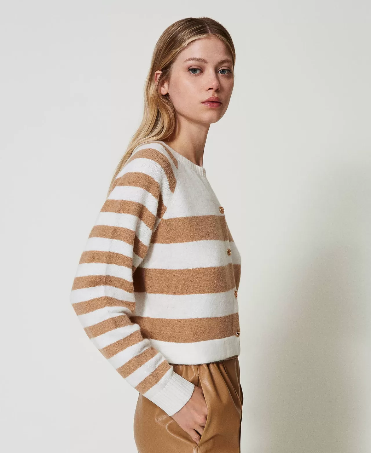 Maglie E Cardigan | TWINSET Milano Cardigan A Righe Bicolore Bicolor Bianco Neve / Marrone “Sandy Brown”