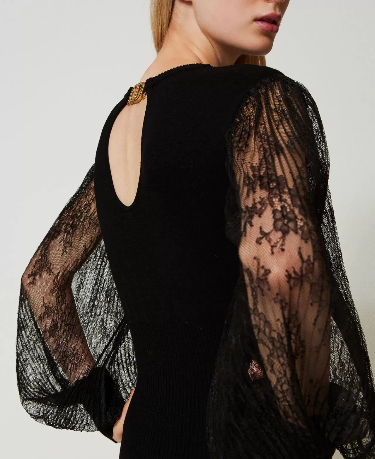Vestiti Da Cerimonia | Vestiti Eleganti | TWINSET Milano Abito Longuette In Maglia E Pizzo Nero