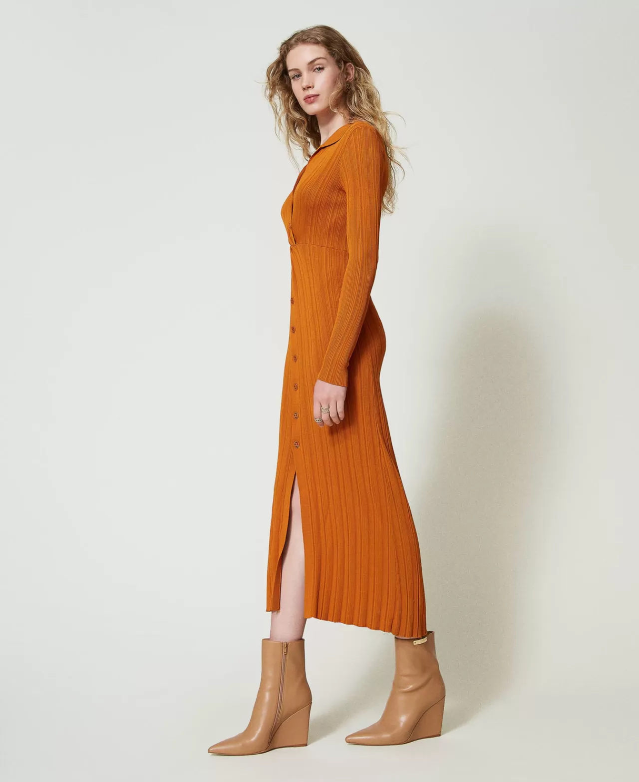 Vestiti In Maglia | Vestiti Lunghi | TWINSET Milano Abito Lungo In Maglia Con Arricciatura Arancio “Tennè”
